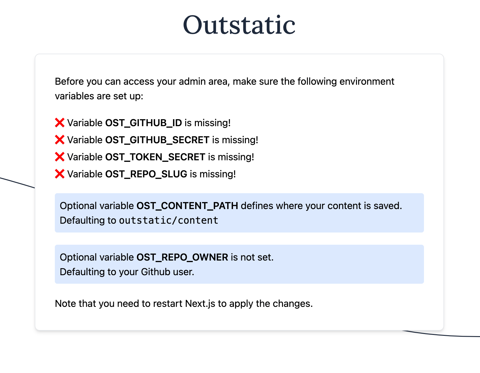 OST_REPO_BRANCH=YOUR_GITHUB_REPOSITORY_BRANCHRestart your service and reload the /outstatic page.